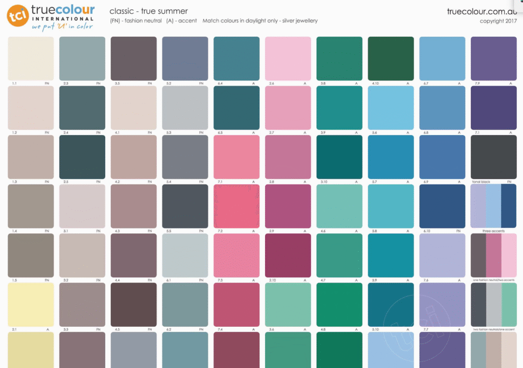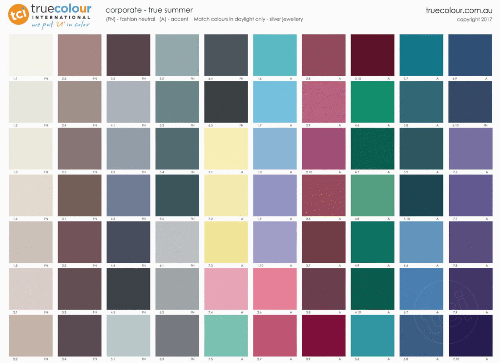 V systému barevné typologie True Colour International (TCI) patří Pravé léto mezi čistě studené typy. Není tu ani stopa tepla – každá barva má modrý nebo šedý podtón. Je to nejchladnější ze tří letních palet a působí velmi sofistikovaně.