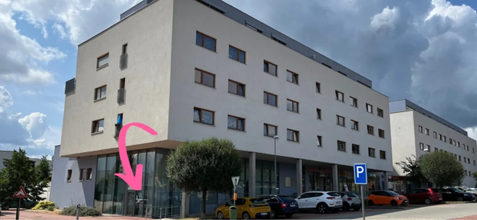 Studio se nachází v přízemí na rohu domu 1389/C. Není zde zvonek. Dveře jsou otevřeny.